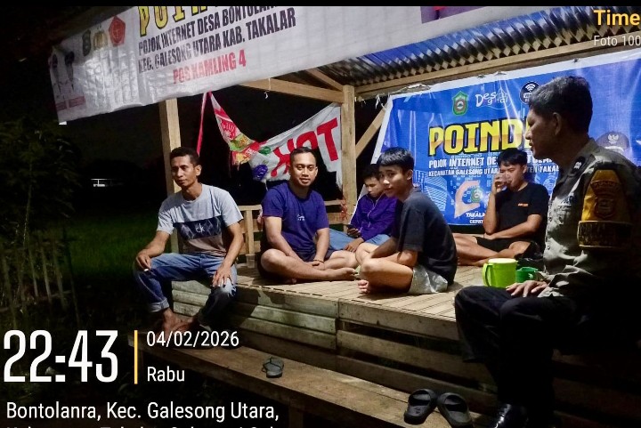 TAKALAR – Guna menciptakan situasi keamanan dan ketertiban masyarakat (harkamtibmas) yang aman dan kondusif, Bhabinkamtibmas Desa Bontolanra, Aiptu Arifin, melaksanakan patroli malam sekaligus kontrol Pos Keamanan Lingkungan (Poskamling) di Dusun Kampung Parang, Desa Bontolanra, Kecamatan Galesong Utara, Kabupaten Takalar, Rabu (04/02/2026) sekitar pukul 22.30 Wita.