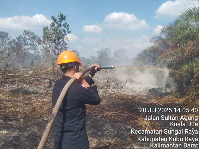Apinusantara.com- Pontianak, Kalimantan Barat — Satuan Brimob Polda Kalimantan Barat kembali bergerak cepat dalam penanganan kebakaran hutan dan lahan (karhutla) di wilayah rawan. Kali ini, pemadaman dilakukan di lahan kosong Jl. Sultan Agung Kuala Dua, Kecamatan Rasau Jaya, Kabupaten Kubu Raya, Senin (21/07).
