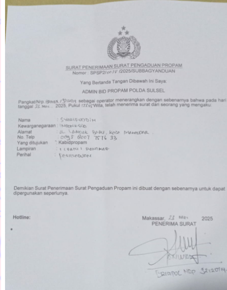 Makassar, 5 Juni 2025—Laporan dugaan pelanggaran prosedur oleh oknum Brimob dalam pembongkaran paksa lapak milik pedagang bernama Syarifuddin di Pasar Senggol, Makassar, hingga kini belum menunjukkan kemajuan penanganan. Para pedagang yang mengadukan kasus ini ke Bidang Propam Polda Sulsel dengan nomor : SPSP2/100/IV/2025/SUBBAGYANDUAN, sejak 23 Mei 2025, menyatakan kekecewaan atas mandeknya proses hukum.