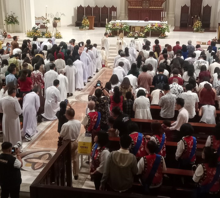 Suasana di dalam gereja tampak khusyuk, dengan umat mengikuti setiap rangkaian liturgi secara tertib dan penuh penghayatan. Cahaya lilin yang dinyalakan menjadi simbol harapan dan kebangkitan, menciptakan nuansa sakral yang mendalam.