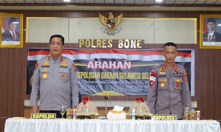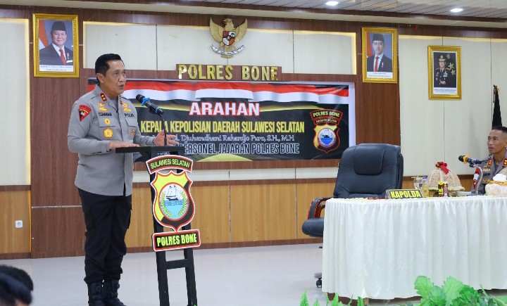 Kapolda Sulawesi Selatan Irjen Pol. Djuhandhani Rahardjo Puro, S.H., M.H., melaksanakan kunjungan kerja ke Polres Bone, Senin (06/04/2026). Kunjungan tersebut bertujuan untuk memberikan arahan serta penguatan kepada seluruh personel dalam pelaksanaan tugas kepolisian di wilayah hukum Polres Bone.