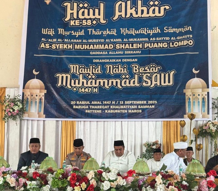 Maros – Kapolres Maros, AKBP Douglas Mahendrajaya, S.H., S.I.K., M.I.K., M.Tr.Opsla, menghadiri kegiatan Haul Akbar sekaligus Peringatan Maulid Nabi Muhammad SAW 1447 H Jema’ah Khalwatiyah Samman yang digelar di Dusun Pattene, Desa Temmappaduae, Kecamatan Marusu, Kabupaten Maros, pada Sabtu (13/9/2025).