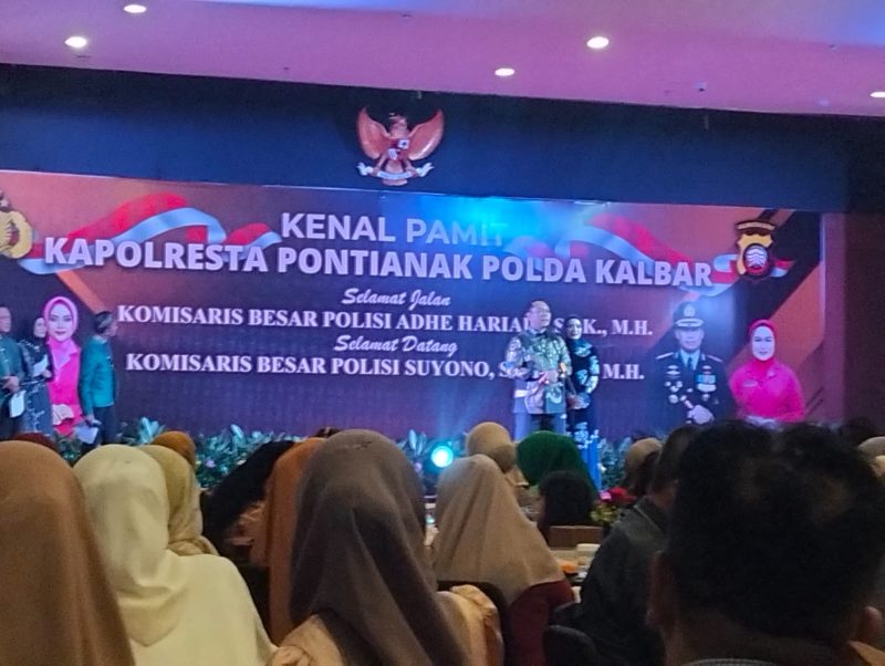 Apinusantara.com- Pontianak, Kalimantan Barat — Serah terima jabatan Kepala Kepolisian Resor Kota (Kapolresta) Pontianak resmi berlangsung dalam acara Kenal Pamit antara Kombes Pol Adhe Hariadi, S.I.K., M.H. dengan Kombes Pol Suyono, S.I.K., S.H., M.H. Acara ini diselenggarakan di Ballroom Hotel Aston Pontianak, Senin malam (21/7), pukul 19.00 WIB.