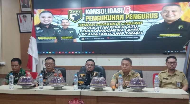 Makassar – Angkatan Pemersatu Pemuda Indonesia (APPI) menggelar kegiatan konsolidasi dan pengukuhan Dewan Pengurus Cabang (DPC) Kecamatan Ujung Tanah, Selasa (27/1/2026), bertempat di Aula Kantor Camat Ujung Tanah, Kota Makassar.Kegiatan ini menjadi momentum penguatan struktur organisasi sekaligus penegasan komitmen APPI dalam mendukung pembangunan dan program Pemerintah Kota Makassar.Acara tersebut dihadiri langsung Ketua Umum DPP APPI Irfan Darmawan SH,MH,Ketua Dewan Penasihat APPI Kota Makassar Dr. Syarif S.Pd., M.Pd., Sekretaris Jenderal APPI Kota Makassar, Wakil Ketua Umum, jajaran pengurus DPP dan DPD, serta Srikandi APPI Kota Makassar.