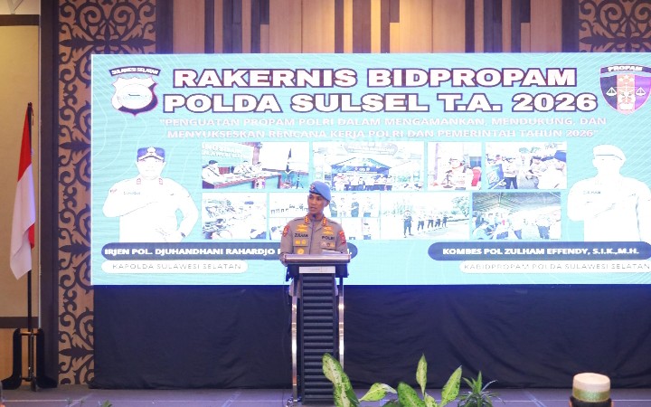 Kapolda Sulawesi Selatan Irjen Pol. Djuhandhani Rahardjo Puro, S.H., M.H., secara resmi membuka kegiatan Rapat Kerja Teknis (Rakernis) Bidpropam Polda Sulsel Tahun Anggaran 2026 yang dilaksanakan di Hotel Harper, Selasa (07/04/2026).