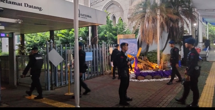 Jakarta. Sebanyak 154 personel Polres Metro Jakarta Pusat dikerahkan untuk mengamankan ibadah Paskah di Gereja Katedral, Minggu (20/4). Sterilisasi dilakukan untuk memastikan kelancaran dan keamanan ibadah.