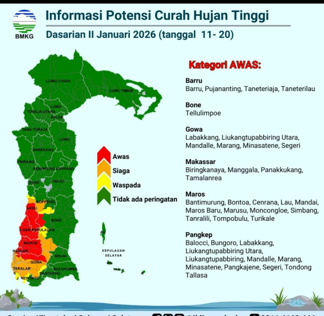 “Berdasarkan informasi BMKG, wilayah Kabupaten Maros berpotensi mengalami curah hujan dengan intensitas sedang hingga tinggi mulai tanggal 11 sampai 20 Januari. Untuk itu, kami mengimbau masyarakat agar tetap waspada dan berhati-hati dalam beraktivitas, terutama di daerah yang rawan banjir dan longsor,” ujar AKP Ahmad, Sabtu (10/1/2025).