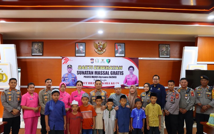 Maros, Sulsel – Dalam rangka memperingati HUT Bhayangkara ke-79, Polres Maros menggelar kegiatan bakti kesehatan berupa sunatan massal gratis bagi anak-anak yang berasal dari keluarga kurang mampu.