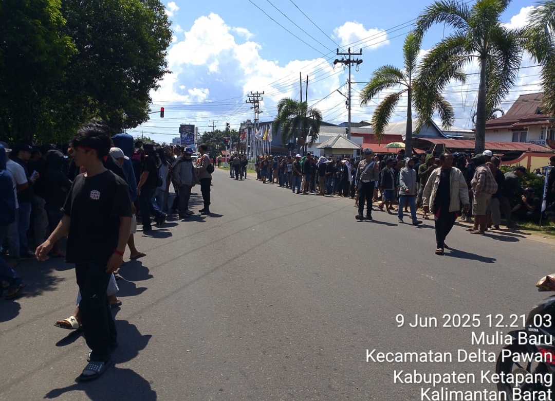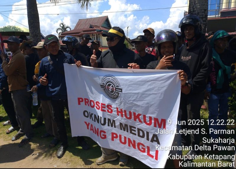 Apinusantara.com- Ketapang Kalimantan Barat- Ratusan penambang emas tanpa izin (PETI) dari Kecamatan Mantan Hilir Selatan (MHS), Kabupaten Ketapang, Kalimantan Barat, melakukan aksi unjuk rasa di Mapolres Ketapang, Senin (9/6/2025) sekitar pukul 11.35 WIB. Mereka menuntut pembebasan seorang pekerja tambang bernama Roni Paslah, warga Desa Sungai Besar, yang ditangkap polisi karena terlibat pemukulan terhadap seorang jurnalis.