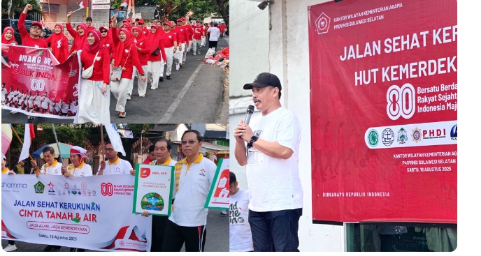 Makassar Sulawesi Selatan– Ribuan peserta dari berbagai elemen masyarakat memadati Jalan Nuri, Makassar, pada Sabtu (16/8/2025) untuk mengikuti Jalan Sehat Kerukunan yang diselenggarakan oleh Kantor Wilayah Kementerian Agama (Kanwil Kemenag) Provinsi Sulawesi Selatan. Acara ini merupakan bagian dari rangkaian perayaan Hari Ulang Tahun (HUT) ke-80 Kemerdekaan Republik Indonesia.