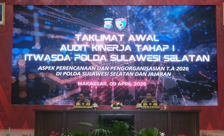Wakil Kepala Kepolisian Daerah Sulawesi Selatan (Wakapolda Sulsel) Brigjen Pol. Nasri, S.I.K., M.H., secara resmi membuka kegiatan Pembukaan Taklimat Awal Audit Kinerja Inspektorat Pengawasan Daerah (Itwasda) Polda Sulsel Tahap I Tahun Anggaran 2026. Kegiatan tersebut berlangsung di Aula Mappaoddang Mapolda Sulsel, Kamis (09/04/2026).